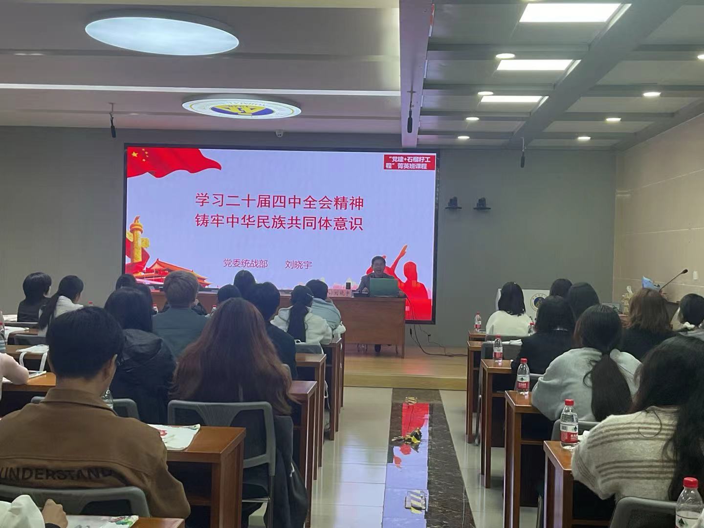 11月15日下午,第八期“党建+石榴籽工程”菁英培训班在一站式学生社区·学生之家开展铸牢中华民族共同体意识教育,校党委统战部常务副部长刘晓宇为培训班学员作《学习二十届四中全会精神,铸牢中华民族共同体意识》专题辅导报告。报告由培训班班主任赵茜主持。