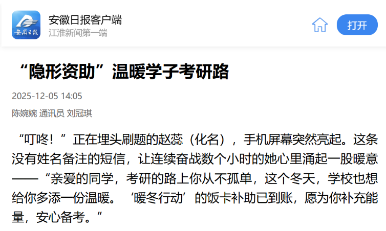 “叮咚!”正在埋头刷题的赵蕊(化名),手机屏幕突然亮起。这条没有姓名备注的短信,让连续奋战数个小时的她心里涌起一股暖意——“亲爱的同学,考研的路上你从不孤单,这个冬天,学校也想给你多添一份温暖。‘暖冬行动’的饭卡补助已到账,愿为你补充能量,安心备考。”