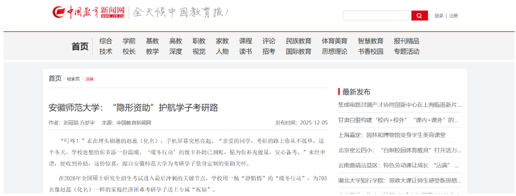 “叮咚!”正在埋头刷题的赵蕊(化名),手机屏幕突然亮起。“亲爱的同学,考研的路上你从不孤单,这个冬天,学校也想给你多添一份温暖。‘暖冬行动’的饭卡补助已到账,愿为你补充能量,安心备考。”未经申请,便收到补助,这份惊喜,源自安徽师范大学为考研学子量身定制的资助关怀。