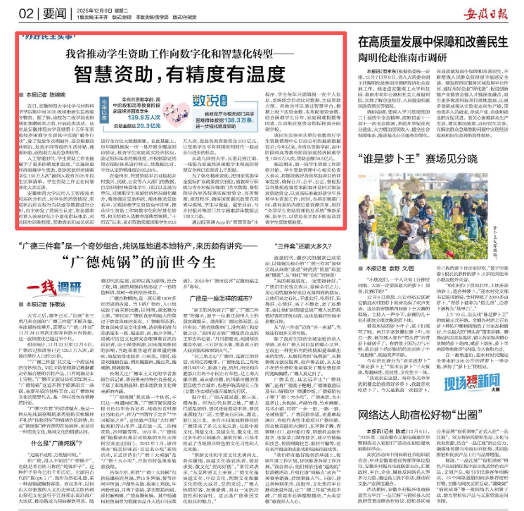 在亳州市,智慧资助平台对接起乡村振兴、民政、公安等八大部门的数据,自动识别特殊群体学生,可以以县域为单位,对困难学生家庭经济状况量化赋分,精准确定受助档次,精准推送受助名单,实现困难学生资助免申即享,推动学生资助工作向数字化和智慧化转型,相关经验入选教育部典型案例。“十四五”以来,该市资助家庭困难学生92.6万人次,发放各类资助资金10.3亿元,让受助学生享有同国家和时代一起成长与进步的机会。