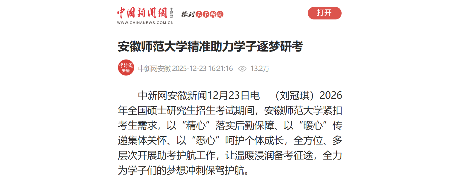 中新网安徽新闻12月23日电 (刘冠琪)2026年全国硕士研究生招生考试期间,安徽师范大学紧扣考生需求,以“精心”落实后勤保障、以“暖心”传递集体关怀、以“悉心”呵护个体成长,全方位、多层次开展助考护航工作,让温暖浸润备考征途,全力为学子们的梦想冲刺保驾护航。