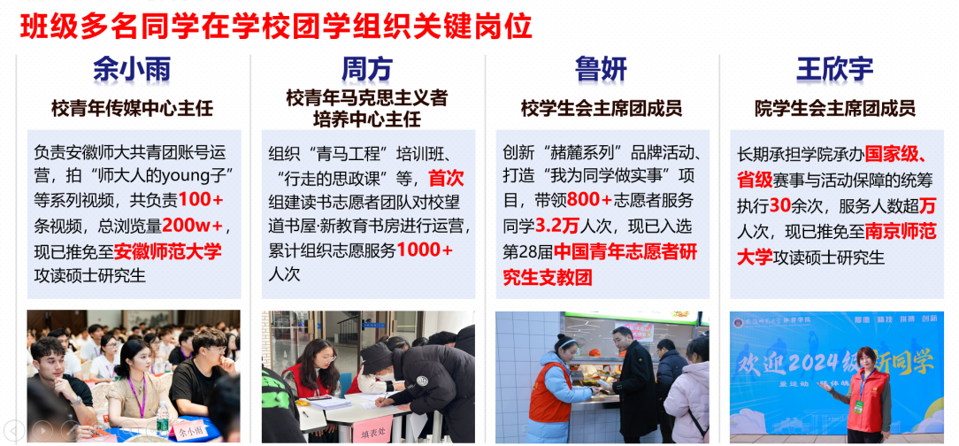 管理有硬度,织密安全防护网。落实“楼长-层长-寝室长”三级网格化管理体系和常态化查寝机制,切实做到班级零违规、零违纪、零安全事故。服务有温度,构建温情共同体。将生活护航做到日常做到精细做到个性化,班级实现“一人一档”精准关怀,及时疏导班级同学学业、生活压力,帮助15名同学解决成长难题。定期组织心理解压工作坊、寝室趣味联谊等活动,让“不是家人,胜似家人”的氛围成为班级底色。引领有广度,激发群体内驱力。从全国学联第二十八次代表大会正式代表到校院学生组织核心骨干,4名同学在学校团学组织关键岗位发挥作用,以朋辈引航助推班级发展,从“个体卓越”迈向“群体优秀”,实现了“一人领跑”到“众人同行”的生动局面。