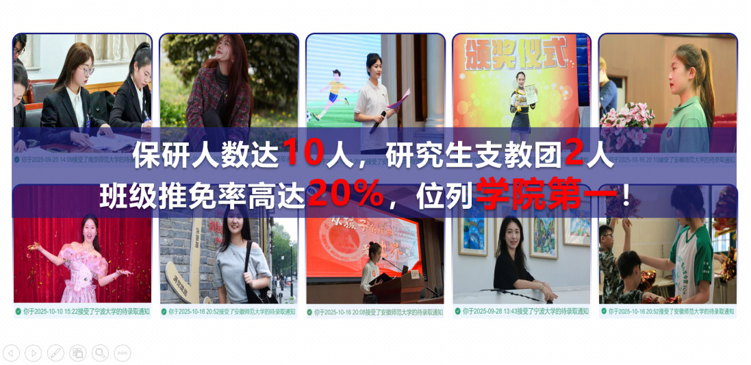 班级全员递交入党申请书,党员和积极分子占比超过80%,220宿舍“全员党员、全员保研”更是成为班级闪亮的青春坐标。以创新为要,打造专业融通的思政课堂,累计开展“排练厅里的微党课”等品牌党团活动百余次;打造“奥运冠军进课堂”特色项目,邀请奥运冠军邓琳琳走进课堂,与同学们面对面交流,让思政教育与专业训练同频共振。以担当为荣,践行爱校荣校的青春使命。三年来实现开学典礼、毕业典礼、教师节颁奖礼等重大活动全覆盖参与,在沉浸式体验中感悟师大精神、厚植爱校荣校情怀。我们不仅要做专业领域的佼佼者,更要做红色基因的坚定传承者。