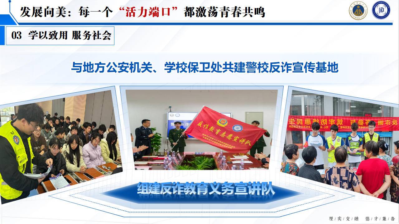 主创的校运会火箭展示获主流媒体广泛报道,班级将活力融入担当,组建校警反诈义务宣讲队,共建警校反诈基地,守护师生们的财产安全,班级0电诈。