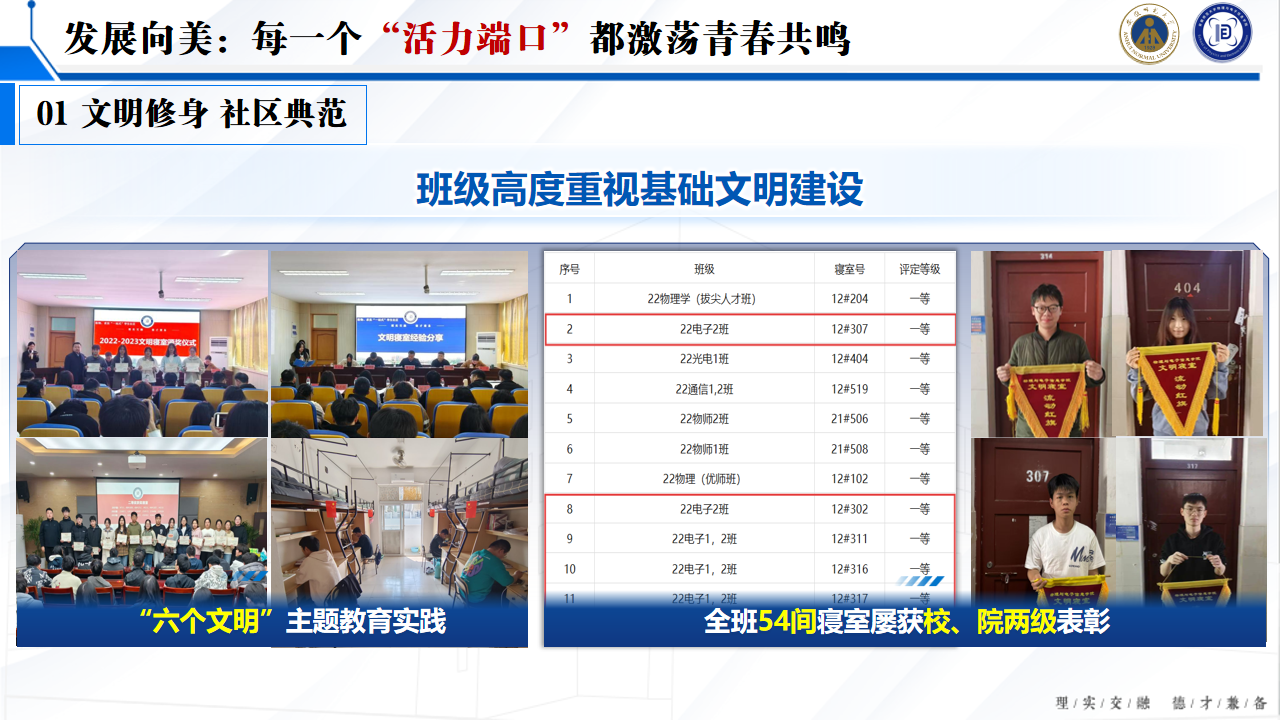 优秀的班集体,更是每一位成员心灵的港湾和活力的源泉。班级深耕基础文明,54间次寝室获校、院表彰参与格物“一站式”学生社区建设,格物社区助力学校成为全省“一站式”学生社区综合管理模式建设A级高校。