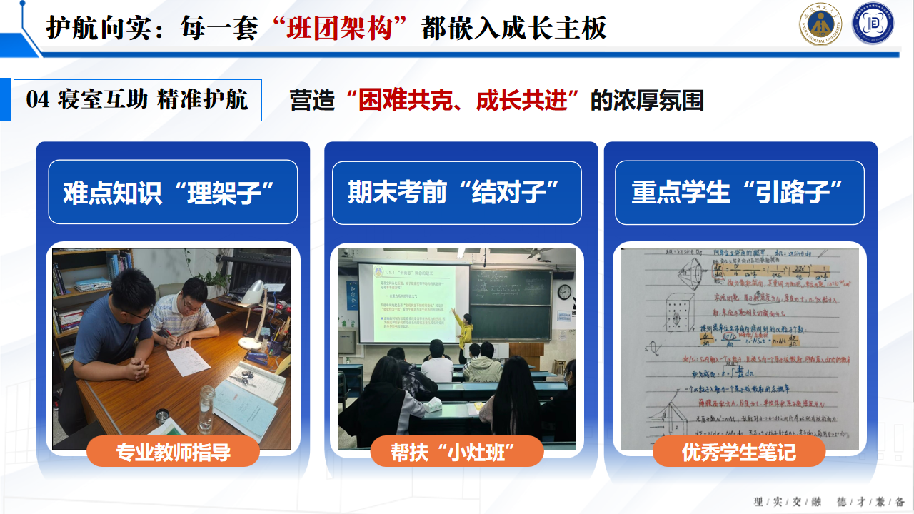 寝室互助,精准护航:在班级内部,以宿舍为单位整合成立互助小组,营造了“困难共克、成长共进”的浓厚氛围。例如在学业帮扶上,开展帮扶“小灶班”,通过难点知识“理架子”、期末考前“结对子”、重点学生“引路子”等精准帮扶。成功帮助班级唯一1名复学同学实现从13门课程不及格到仅剩1门,切实将育人工作落实到“最后一公里”。