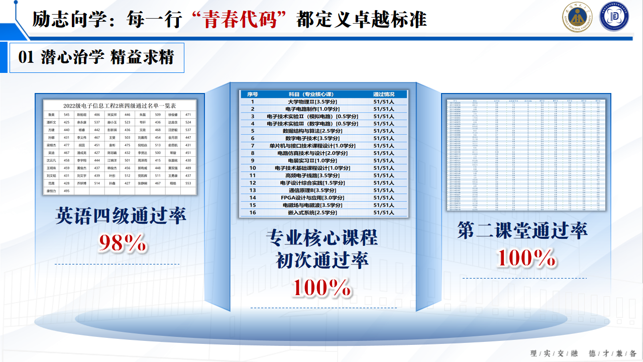 电子信息工程作为国家级一流专业建设点,国家级特色专业,专业课程多、难度大、实操强。但仍创下2024-2025学年,专业核心课初次通过率100%,英语四级通过率98%的优异成绩。