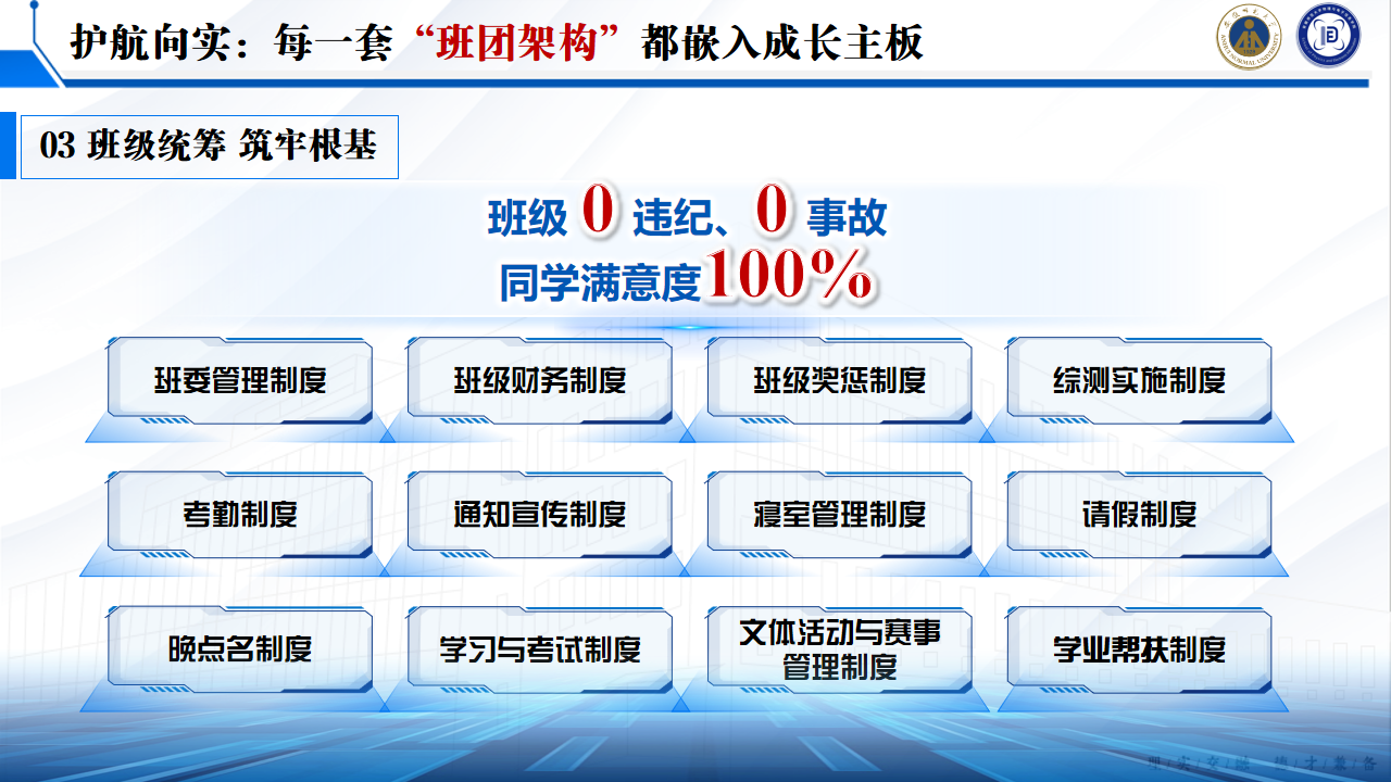 班级统筹,筑牢根基:创新构建“班委会与团支委会一体化”协同运行机制,设置科技竞赛委员;建立了学风建设、寝室文明等在内的十余项特色护航制度。实现班级满意度100%、班级0违纪、0事故。