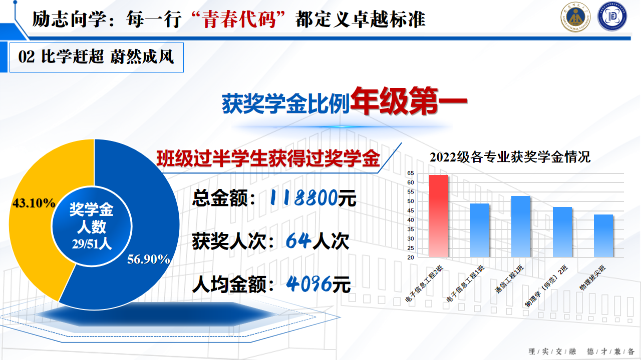 班级57%的同学,荣获各类奖学金。奖学金总额118800元,班级“比、学、赶、超”蔚然成风。