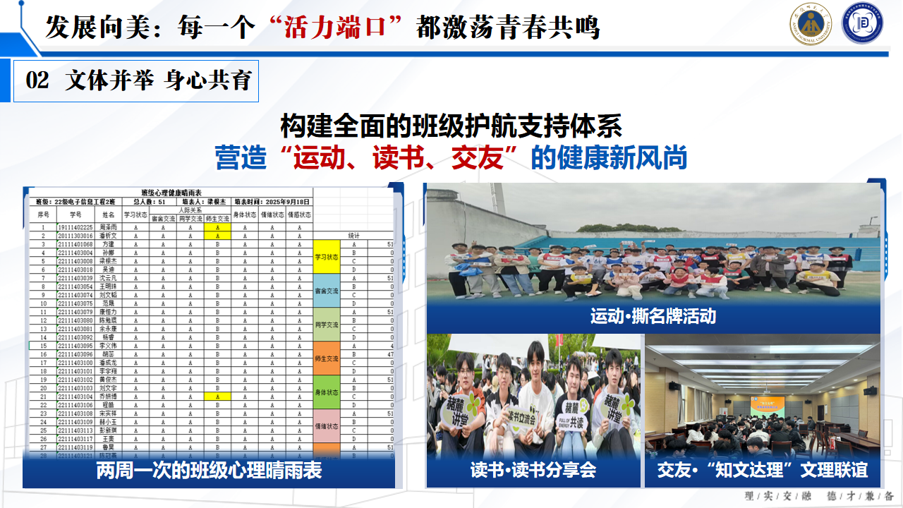 构建了全面的班级护航支持体系,建立心理晴雨表,营造“运动、读书、交友”的健康风尚,组织参与文理科跨班联谊、“聚变青春”文体艺术节等特色活动近百场,实现素拓与体测通过率双100%。