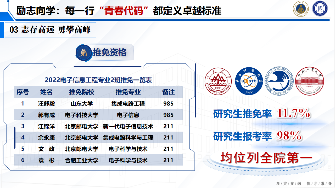 学业硕果终体现在更高的平台上,班级推免课程平均分高达84.83分,研究生报考率98%,位列全校第一;6名同学推免至电子科技大学、山东大学等一流高校,推免率为11.7%,位列全院第一。