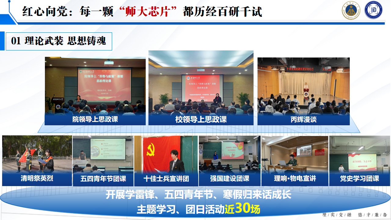 班级坚持三会两制一课,校院领导专题讲思政课2场,开展爱国、爱党等主题学习、团日活动近30场。