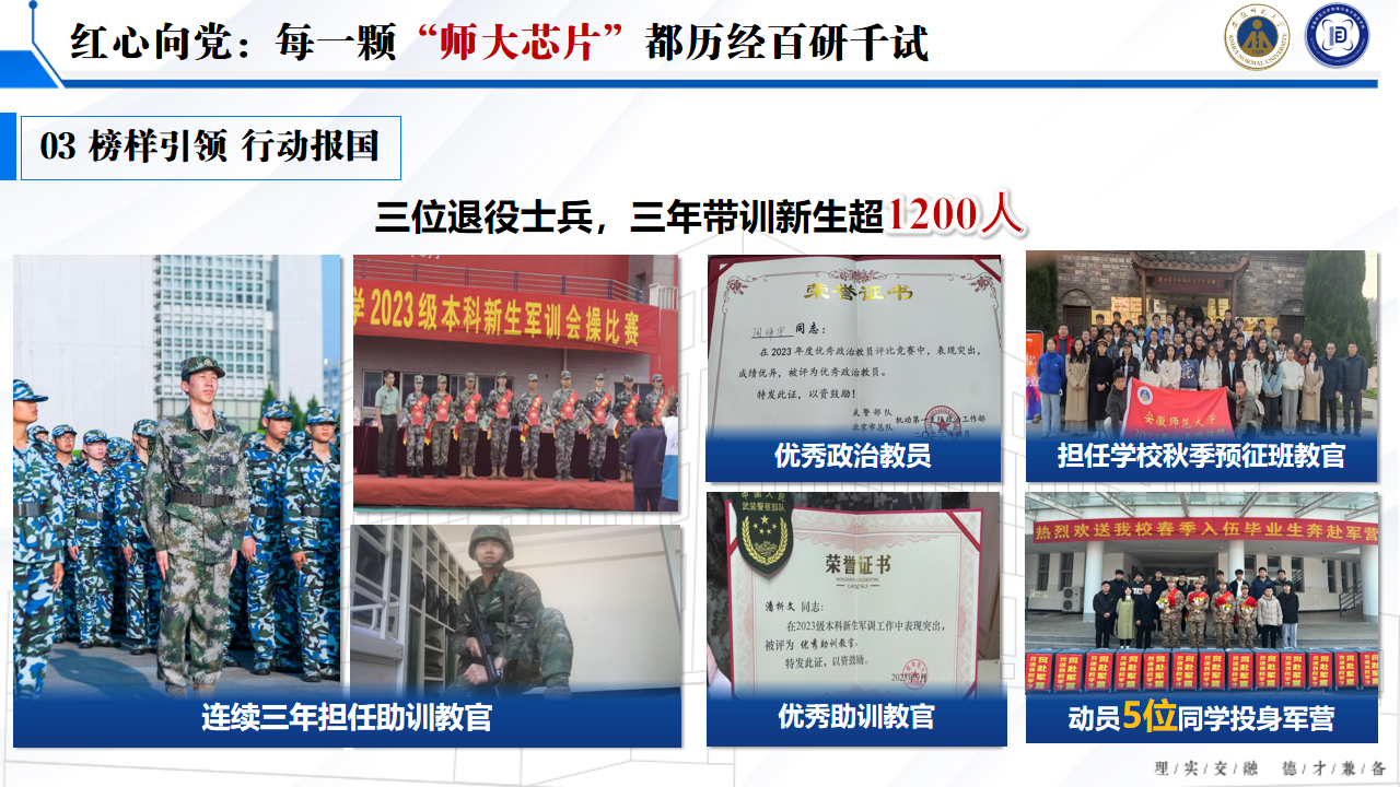 班级3名退役士兵班委,3年带训新生超1200人,积极宣讲征兵政策,开展预征动员,动员5名同学参军报国。助力学院连续三年荣获“军训优胜营一等奖”,他们用行动证明,信仰不仅在课堂里,更在祖国最需要的地方。班级曾获评校级“优秀团支部”等荣誉称号。