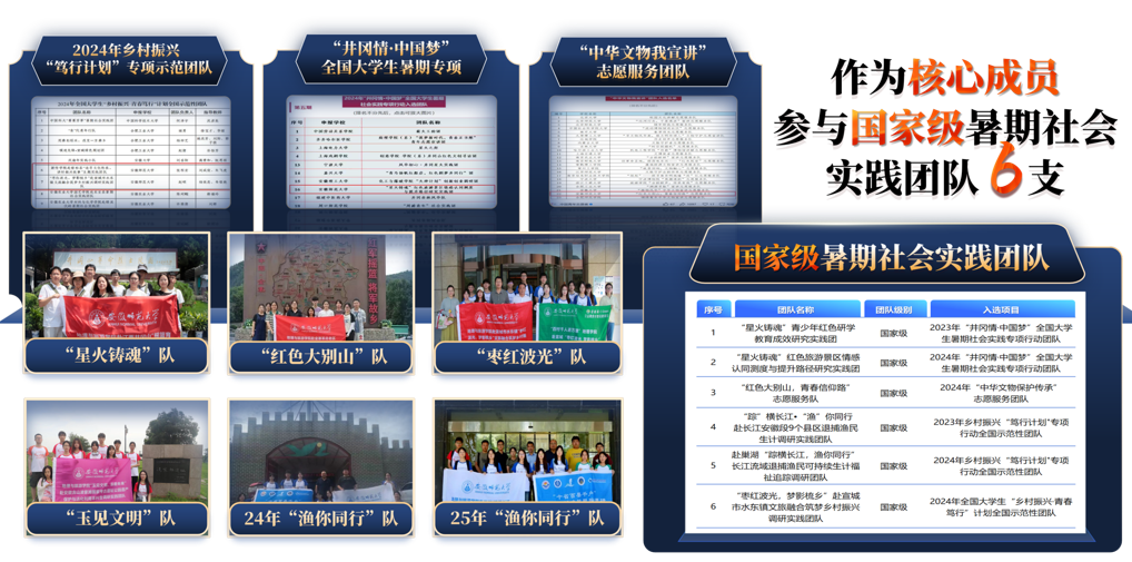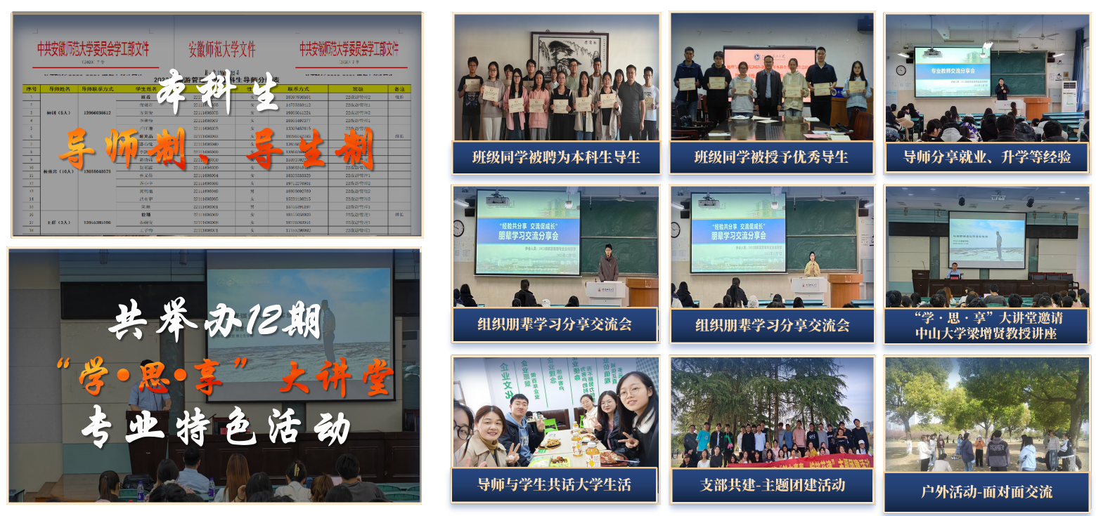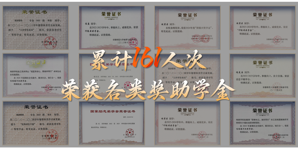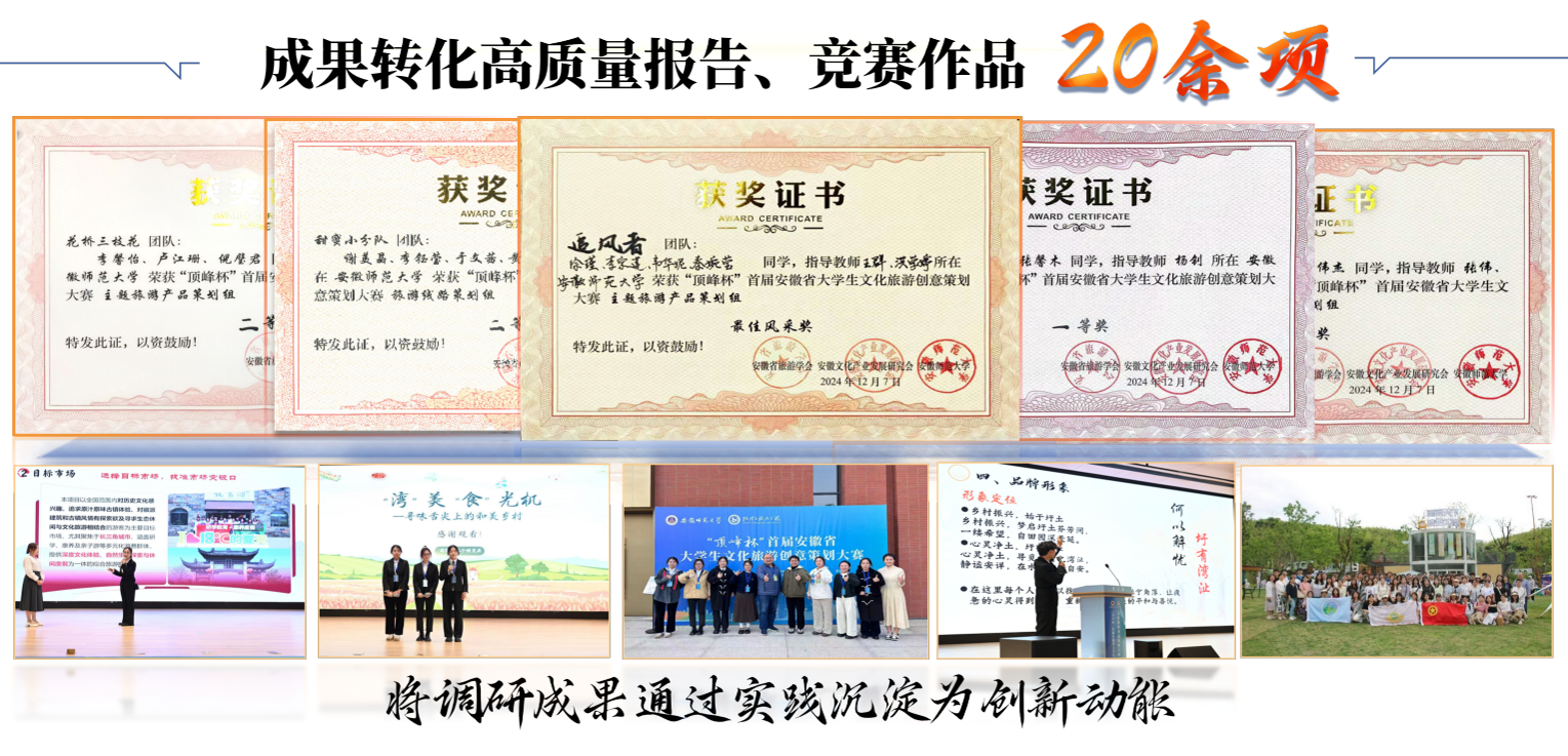 班级注重学风实践并举,汇聚青春成才之能。1.厚植优良学风,激活学习动能。班级学风浓厚、锐意进取,前3学年专业课成绩高于80均分占比超70%,围绕期末备考等主题开展学习活动40余场。累计获各类奖学金161人次,推免率达11.11%,全院最高。竞赛方面,荣获“挑战杯”、红色旅游策划大赛等省级以上奖项48项。2.扎根调研一线,汇聚青春动能。班级100%参与社会实践,组建国家级团队6支,事迹获光明日报、人民日报等主流媒体报道50余篇。成果转化高质量报告、竞赛作品20余项,其中“渔见新生”团队穿越15000公里深入观察退捕渔民现状,报告获安徽省副省长批示和农业农村部主管部门采纳,获“挑战杯”国家二等奖、安徽省金奖,作为全校唯一一支队伍进入主体赛全国决赛,实现学院该赛事史上最好成绩。3.见习启航专业,前置规划就业。班级坚持以一流班级促一流专业发展,连续3年组织服务安徽省“职旅天下”促项目,创新打造“开始吧·青年元行”“职业经理人培育计划”等就业活动。担任旅游学刊年会、安徽省茶文化大赛、校园导游、迎新等专业活动志愿者,累计服务人数超20000人,服务总时长达7000小时,40名同学获评“优秀志愿者”。