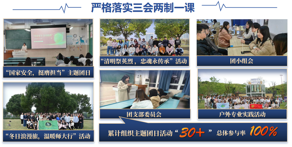 班级始终以大学生护航行动计划为指引,凸显护航成效。1.强化生活护航,筑牢成长基石。班级通过基础制度,实现安全管理闭环,获评“优秀寝室”76次,居全院前列;保持0违规、0违纪、0诈骗!贫困生资助100%全覆盖,200余人次获奖助学金,总金额高达30万,精准资助落到实处。2.深化情感护航,交流助力成长。依托本科生导师制和“学•思•享”大讲堂等专业特色品牌,开展教师面对面、支部共建和朋辈交流,强化师生友谊,营造和谐班风。3.落实身心护航,彰显青春活力。班级坚持身心共育,开展心理活动15次,举办“冬日浪漫旅”等近20次户外活动,体测合格率连续三年保持100%,获文体奖项10余项,充分展现全面发展的良好风貌。