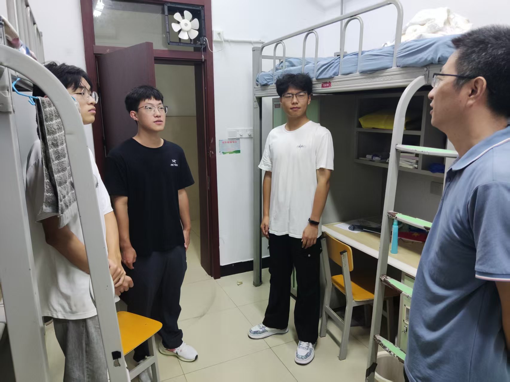 院党委副书记(主持党委工作)孙良林在走访新生宿舍时,与新生们进行了亲切交流,详细关心询问他们入学后的状态感受,了解同学们的需求和困难。他希望同学们尽快适应大学生活和学习变化,鼓励大家科学规划大学生涯、认真学习知识技能、不断提升文明修养。学院将积极帮助大家解决学习、生活上的实际困难,护航同学们成长成才。副院长徐飞在走访中提醒学生要严格遵守校规校纪,做好宿舍个人卫生,晚点名相关工作,勉励学生要珍惜与室友、同学相处的大学时光,要以良好的状态,全身心投入到大学的学习和生活中去,不断提升自己的专业素养与综合能力。