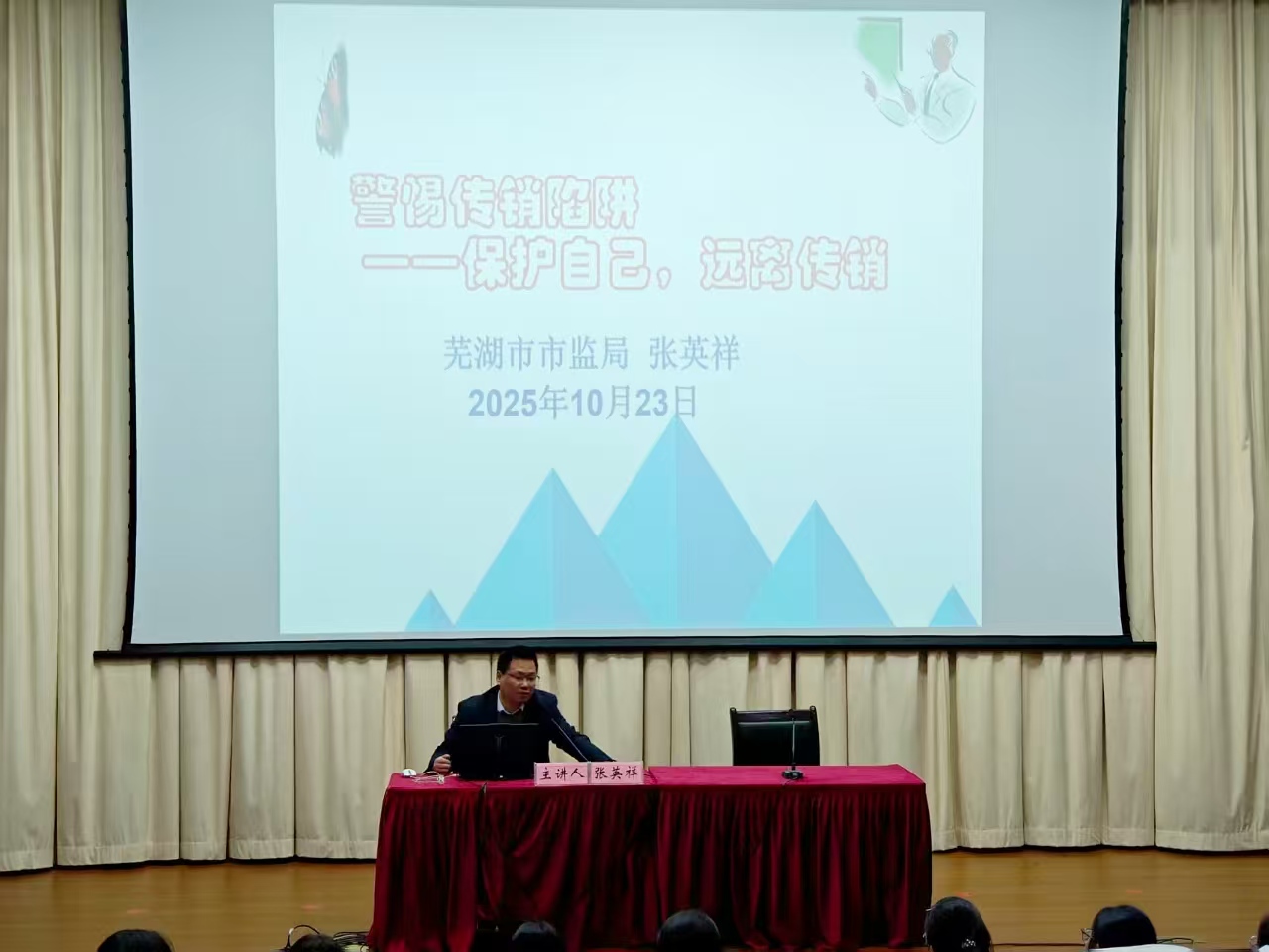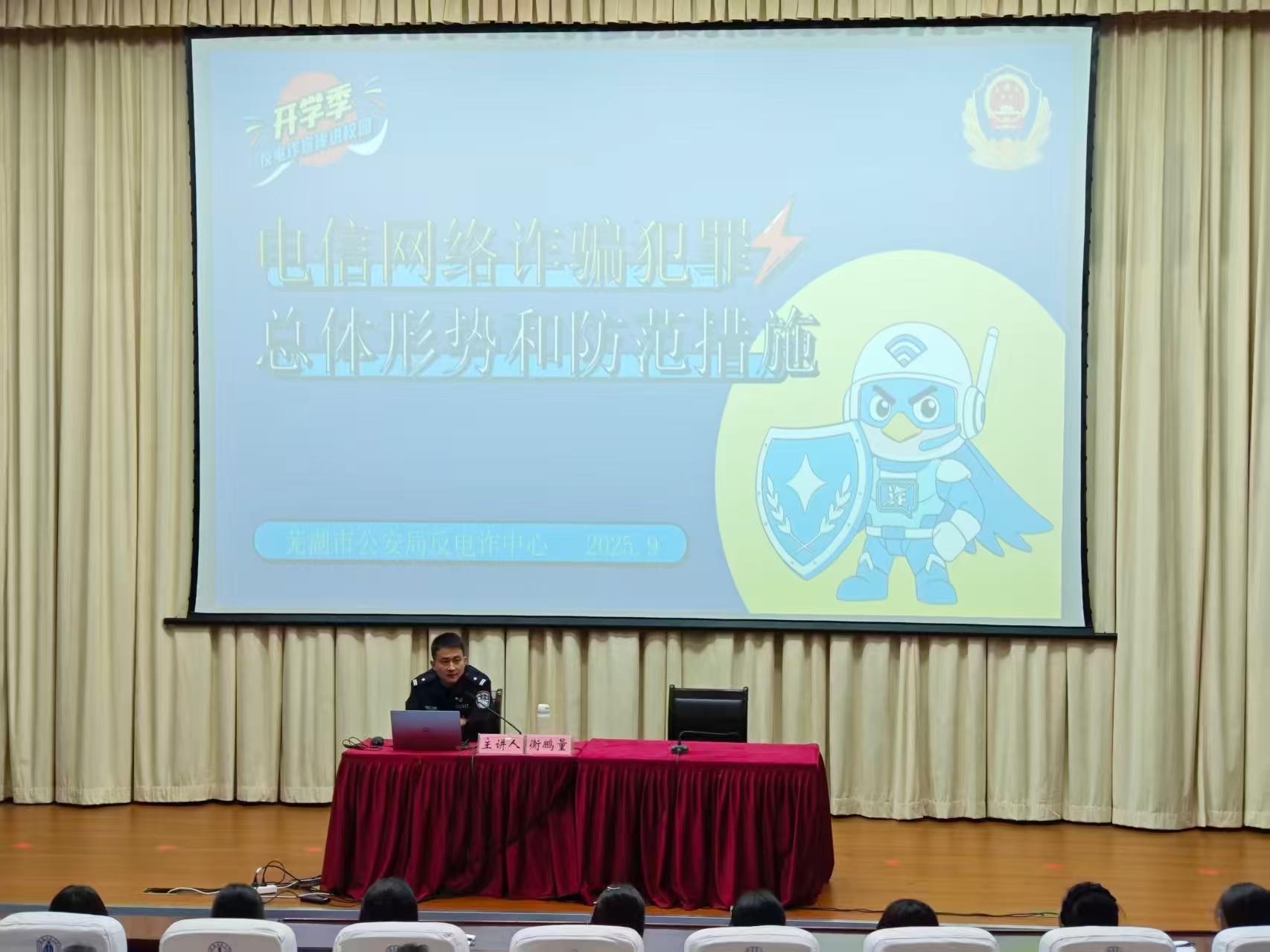 为进一步增强2025级新生安全防范意识,营造平安校园,10月23日,经管学院在赭山校区科技南楼报告厅举办专题讲座,特邀芜湖市公安局网络安全支队大队长衡鹏量、芜湖市市场监督管理局反垄断和反不正当竞争科副科长张英祥为2025级全体新生讲解如何识别与应对网络诈骗、传销陷阱。