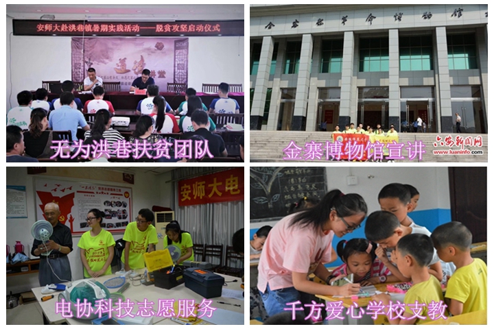 为继承革命传统,发扬红色精神,培育和践行社会主义核心价值观,队员们在金寨县革命博物馆每一个角落,悉心为游客进行问题解答、路线引导,并对博物馆内外的卫生状况进行维护。在殷家山社区、凤凰山社区,科技志愿服务队的志愿者迎着骄阳,踏着酷暑,蹲下维修就是一天,受到了群众热烈欢迎。在无为扶贫办,扶贫团队队员们每天都要入户调查并录入贫困户数据,他们核查了无为县洪巷镇十三个乡的贫困人口贫困户档案。在阜阳、安庆、淮南等省内6个地市,11支“千方爱心学校”支教团队队员立足讲台,开展“趣味物理”、“回首香港回归”、“献礼十九大”等课程和活动,送去了知识和快乐、拓展了学生视野、锻炼了从教技能。他们累计招收并服务448名当地中小学生,他们在孩子们眼中深切感受到了他们对知识的渴求,对支教老师的信赖,也更加清楚了自己肩膀上的责任与使命。昨日,潜山支教团队收到2012年服务对象陈诺的跟踪信息反馈,他已经成功录取至我校2017级城市规划专业,他表示也会加入到支教团队,传播千方爱心。