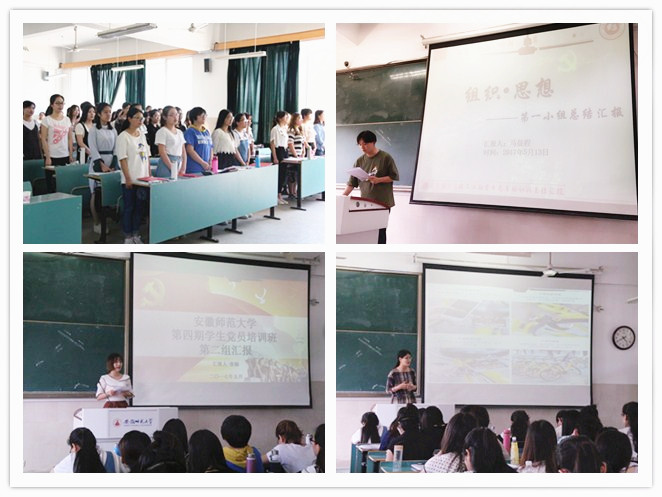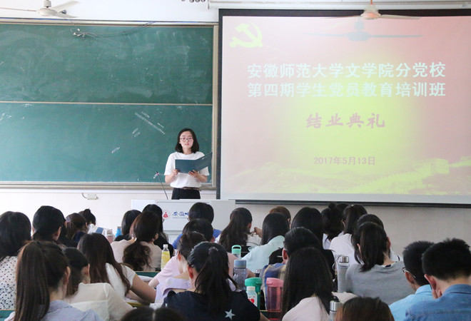 讲座结束后,培训班举行了结业典礼。典礼在庄严的国歌声中开始,接着,由本期党课班2016级中国古代文学专业的研究生王永坚代表发言,他表达了参与此次党课培训班的心得体会,同时表明了学员们加入中国共产党的决心,他说道:“在听到正式党员还要上党课的消息时,我感到惊讶。可是,在上完近两个月的党课后,我的惊讶荡然无存,并从内心深处感到党员同志进行培训、再教育非常必要”。其次,各小组依次轮流作小组成长汇报,四个小组分别从理论学习、实践活动、心得感悟三个方面总结了本期党课培训班的课程活动内容和所得所悟。小组成长汇报后,由汪旭老师对本期党课培训班作总结汇报,她激励学员们要自觉加强党性修养和党性锻炼,时刻以一名党员的身份严格要求自己。最后,戴书记对本期培训班学员们的认真参与表示肯定,同时借由2017年习近平总书记在中国政法大学主题团日中的讲话激励学员们在 “理想信念、读书学习、实践思考、人生态度”四个方面不断完善自我,树立远大的志向、善于学习、积极探索实践,努力实现自己的理想目标,以实际行动彰显青年党员的风采!