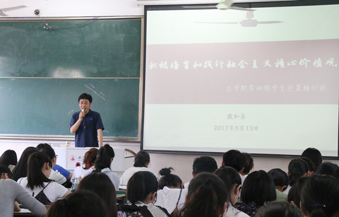 本网讯(文学院 唐霞)5月13日下午三点,文学院分党校第四期学生党员教育培训班在行知楼2030403教室进行了最后一次理论培训课程,文学院党委副书记戴和圣受邀为党课班学员们带来《培育和践行社会主义核心价值观》的专题讲座。本次课程由培训班班主任汪旭老师主持,全体学员共同参与。