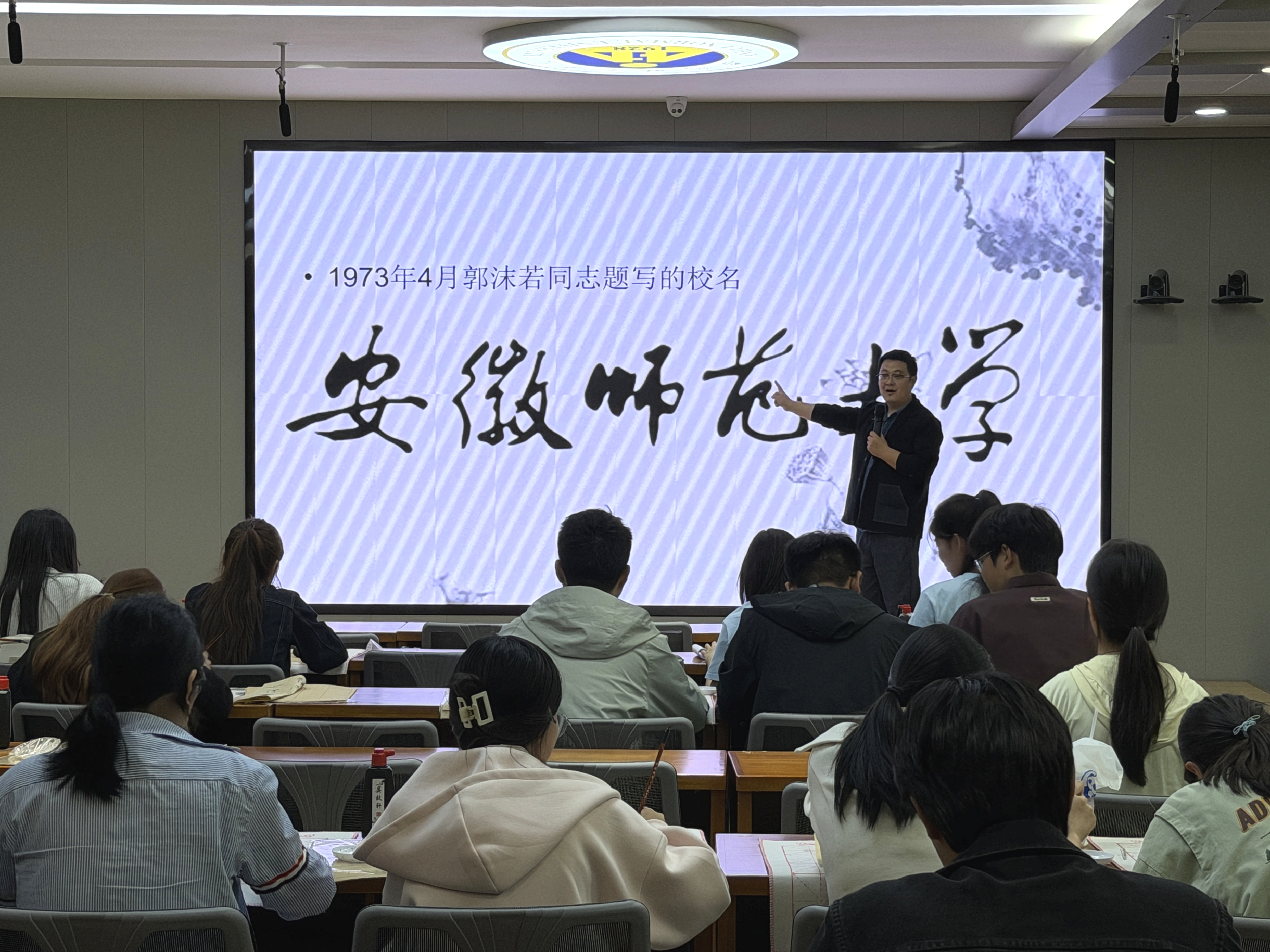 为传承中华优秀传统文化、铸牢中华民族共同体意识,在安徽师范大学喜迎98周年校庆之际,石榴籽菁英班开展“笔墨贺师大”书法讲座及体验活动。活动邀请美术学院书法专业负责人公丕普老师指导,石榴籽班学员以笔墨为桥,探寻书法之美,传递校庆祝福。